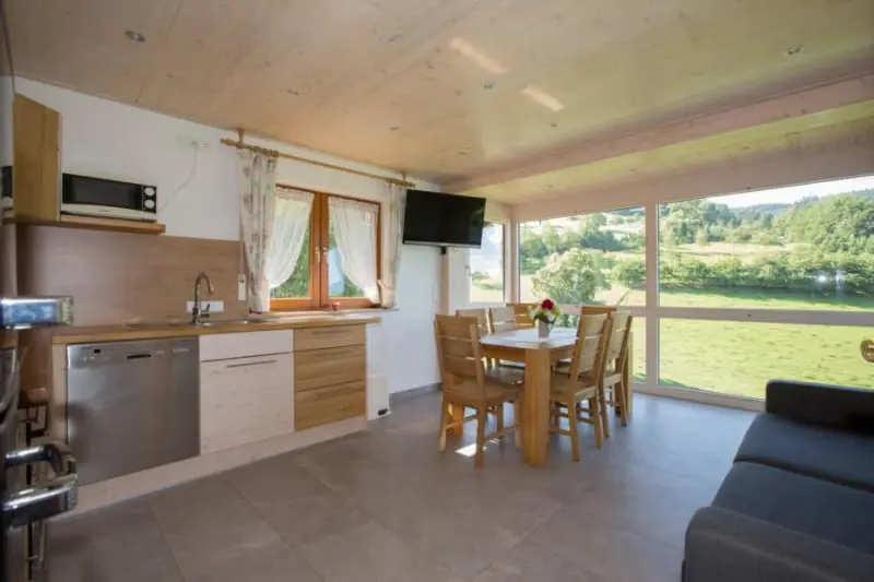 Die Wohnung befindet sich im Obergeschoss des Ferienhauses und hat eine sehr schönen Wohnküche mit Panoramafenster,.